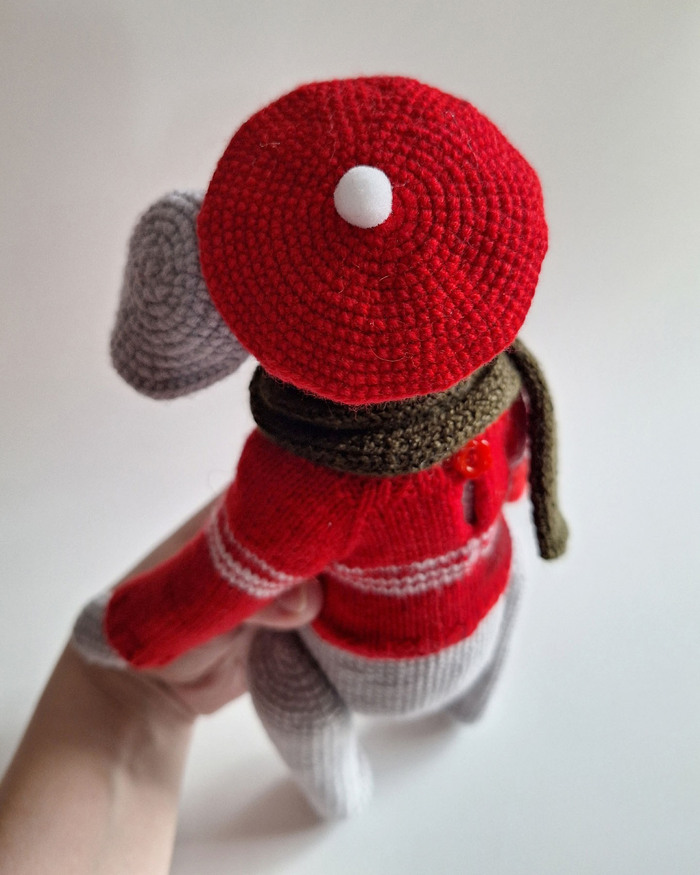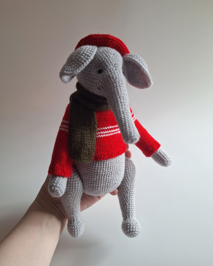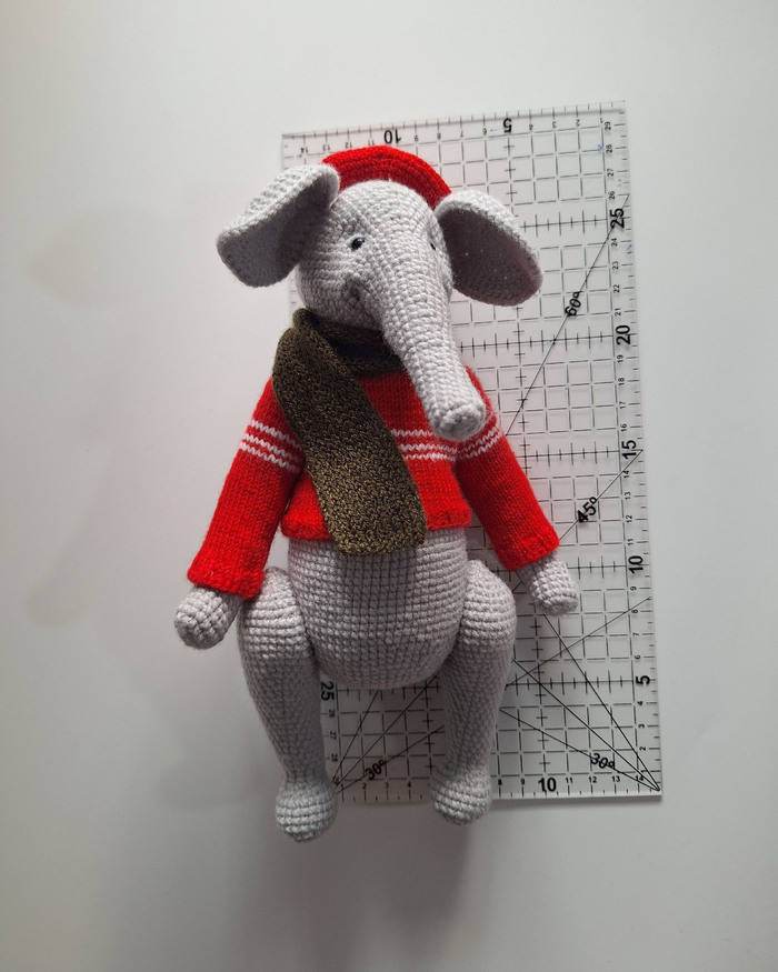 Слон примерно 27 см в высоту вместе с беретом. Связан из детской акриловой пряжи Кроха, берет и свитер из шерстяных ниток Москвичка (если кому-то важно), а шарфик из акрила Семёновской пряжи (нет, он не коричневый, он тёмно-зелёный). Глазки на безопасном креплении.