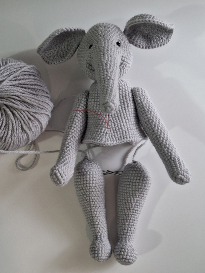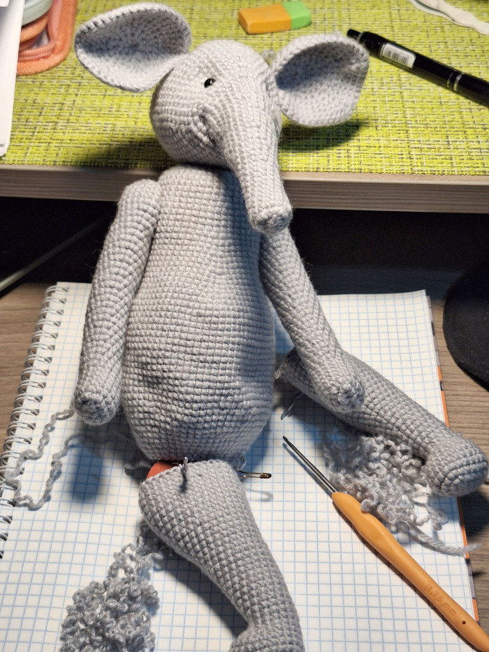 Что в следующий раз я точно Не буду делать - это подбирать диски для креплений не по размеру. Иначе придётся перевязывать ноги и попу, а найти на-совесть спрятанную ниточку, чтобы распустить деталь - тот ещё квест. Ещё распускала голову, чтобы добавить наполнитель и покрепче пришить хобот к голове, но это уже мелочи.