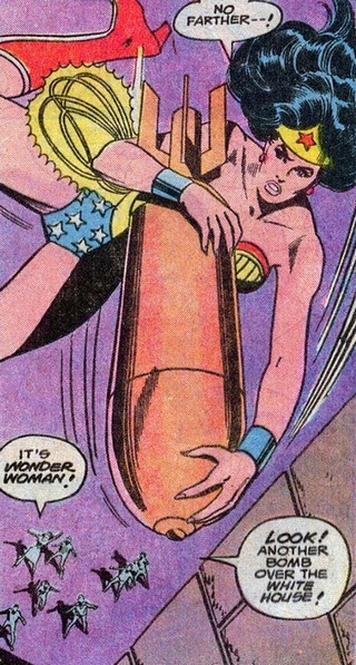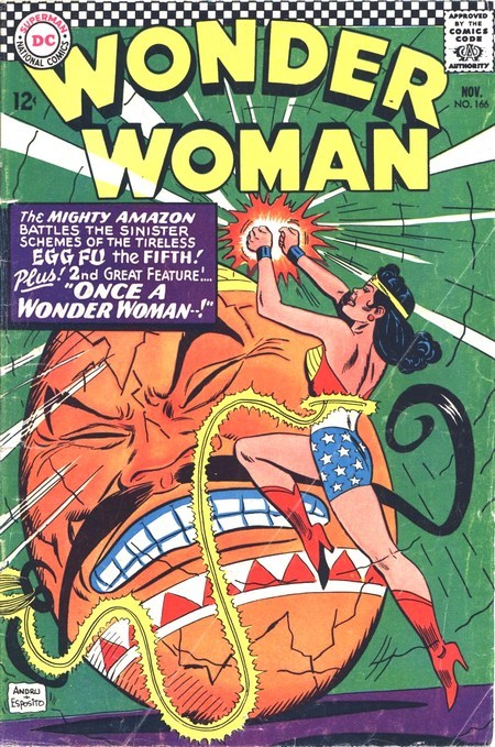 Зловещий план Яйца Фу разворачивается в комиксе Wonder Woman #166. Где-то на просторах океана пропала без следа атомная подводная лодка. Генерал Дарнелл отправляет Стива Тревора на поиски, а за ним увязывается Чудо-Женщина. Оказывается, атомную подлодку угнали подчинённые нового, усовершенствованного Яйца Фу! И Яйцу таки удаётся взять Чудо-Женщину в плен. Но Диана не промах, даже когда её связали её собственным лассо! Она признаёт победу Яйца Фу и предлагает станцевать в его честь. Злое китайское яйцо со злым китайским лицом не плотив посмотлеть на глюпый амеликанский Цюдо-Зенсина – а Диана во время танца с такой силой звякает браслетами, что от звуковых волн Яйцо Фу ломается. Подхватив Стива, Диана сваливает с базы Яйца, но злые китайцы преследуют её на подводной лодке. Злодеи выпускают по Диане и Стиву торпеду – но те, кто читал сегодняшний пост более-менее внимательно, уже знают, как Диана поступает с несанкционированными торпедами. Вернуть отправителю!