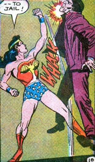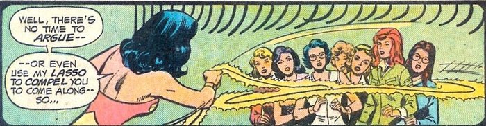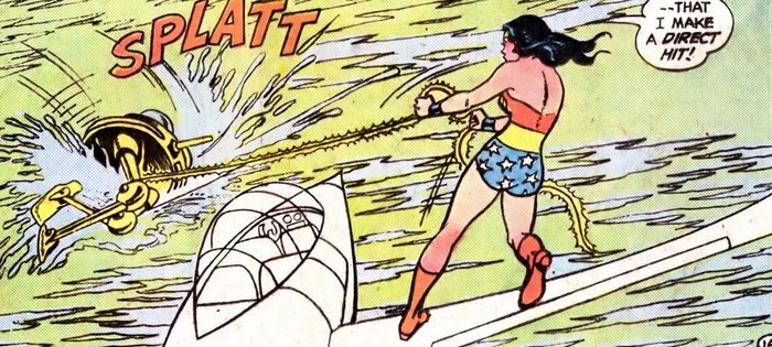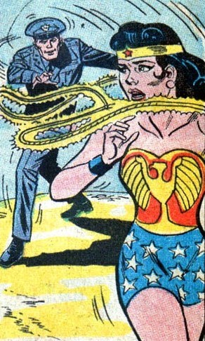 А испытания самолёта продолжаются, и на этот раз в кресло пилота садится сама Чудо-Женщина. Так Диана узнаёт, куда пропадают самолёты – их утягивает под воду магнитный луч с замаскированной подлодки! Под водой на Чудо-Женщину нападают аквалангисты, и берут чисто количеством, после чего заматывают в лассо и приводят пред ясны очи своему начальнику – Угольнику! Любой, кто держит свободный конец лассо, может всячески повелевать тем, кто в лассо замотан, так что Угольник приказывает Чудо-Женщине добыть для него американское оружие – он его перепродаст врагам нации. Стив же пока о таком свойстве лассо не знает, так что когда Чудо-Женщина вынуждена подчиниться, Стив зовёт её предательницей. Стива вся эта ситуация настолько злит, что он бьёт Угольника кулаком по лицу, и тот от неожиданности роняет лассо. Диана оперативно из лассо выматывается и хватает Стива, защищая его от вражеских пуль – и их обоих определяют за борт подлодки. Угольник выпускает в сторону Дианы и Стива торпеду – но Чудо-Женщина перенаправляет её и возвращает отправителю. Подлодка Угольника делает бум, тонет и больше не всплывает, а Диана вкратце объясняет Стиву принцип действия своего лассо. «А, так ты не предательница? Ну круто, значит, я всё ещё тебя люблю, давай жаница? – Не, ну не, пока мир нуждается в Чудо-Женщине, никакой свадьбы. – Ну блин ((».