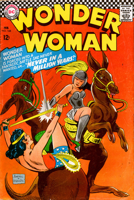 Полный Кенгуряч творится на обложке комикса Wonder Woman #168. В первой истории о себе даёт знать коллекционер бесценных редкостей. Очень уж ему хочется добавить в свою коллекцию лассо Чудо-Женщины, и ради такого он нанимает трёх её врагов – Доктора Психо, Гиганту и Паулу фон Гунту. Чтобы не было скучно, миллионер пообещал награду только одному из нанятых злодеев – «кто из вас лассо мне принесёт, того и вознагражу, остальные в пролёте». Первой на Диану нападает Гиганта и пытается натурально вытрясти из неё Лассо – но пролетает, да ещё и по голове получает. Сдав амбалиху полиции, Чудо-Женщина сталкивается с Доктором Психо, тот пытается обмануть Диану, убедив её в том, что хочет помириться и подружиться – но планы гнусного карлика раскрывает Стив Тревор. Обхитрить Чудо-Женщину удаётся Пауле фон Гунте – но Диана ловит момент, когда Паула теряет бдительность, слепит злодейку бликом, отбирает лассо и сдаёт злодейку полиции вместе с её бандой и коллекционером в придачу.