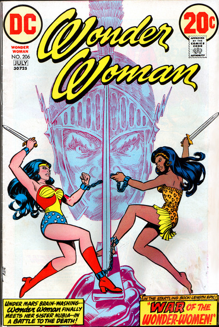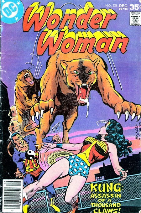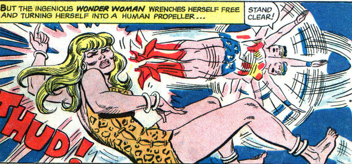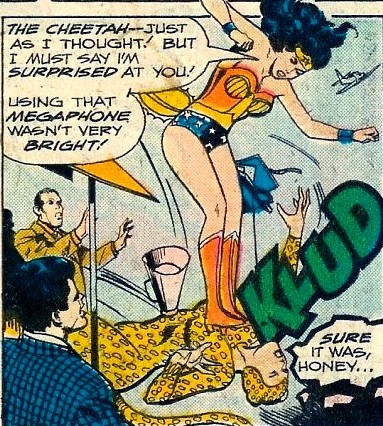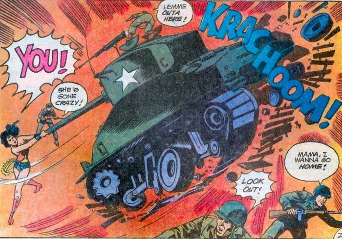 Есть ещё вторая история, в которой Чудо-Женщина страдает фигнёй. В общем, в разговоре с генералом Дарнеллом Стив Тревор обмолвился, что у генерала нет ни шанса на романтику с Чудо-Женщиной, потому что она, Чудо-Женщина, без ума от него, Стива Тревора, и не женаты они лишь из-за её дурацких убеждений. «Ах так!», думает Диана – и решает заставить Стива немного поревновать. И начинает Чудо-Женщина встречаться с генералом Дарнеллом. А Стив ревнует. Но в процессе генерала и Диану загоняют в ловушку бандиты и бросают в клетку со львом. Стив спешит на помощь – но ему достаётся от одного из бандитов по голове. Диана не может спокойно на это смотреть – она обезвреживает льва, вырывается из клетки и раскидывает бандитов, как тараканов. А когда Стив просыпается, Диана, как прилежная девочка, просит прощения за свою выходку и клянётся, что заинтересована только в нём.