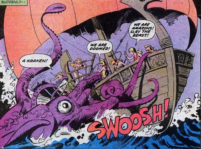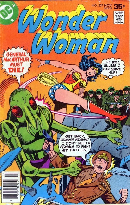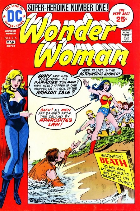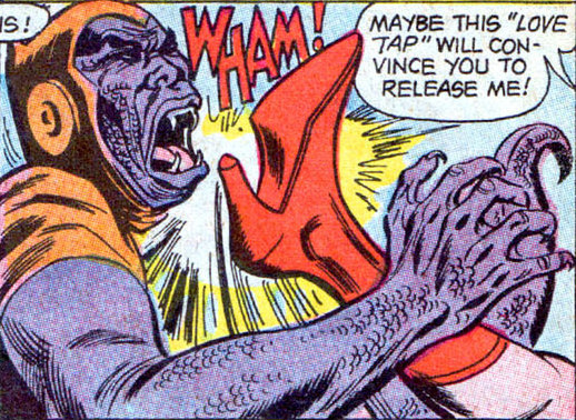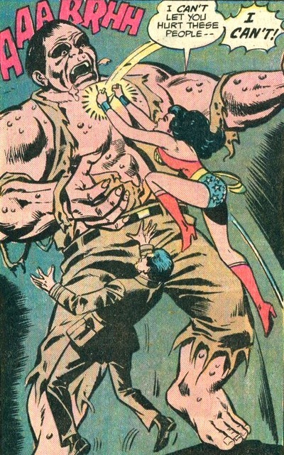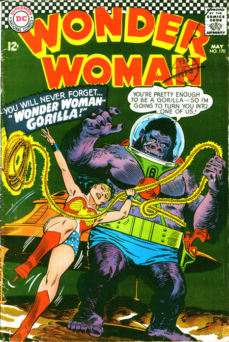 А во второй истории на Землю высаживаются гориллы из открытого космоса. Внезапно, да? И прямо на Райский остров. А что – это же не самцы Хомо Сапиенсов, так что проклятие богинь не активируется. Главный горилыч сообщает: «Мы – сверхразвитая раса горилл из космоса, я выбираю тебя, Чудо-Женщина, в качестве своей самки, а мои бойцы сейчас выберут себе жён из остальных амазонок!». Чудо-Женщина не соглашается с таким исходом и лезет в бой – но сюрприз-сюрприз, силушки то всё, пропали! Похоже, проклятие богинь таки активировалось. Мужики, пусть и инопланетные и волосатые, всё ещё являются мужиками. Амазонки теряют свои силы. Ещё немного – и начнётся божественная аннигиляция острова! Надо поторопиться. Главный бубизян превращает Чудо-Женщину в гориллу, а потом такой «мля, ну и нафига? Красивая баба была, а теперь обезьяна обезьяной. Ну нафиг, Ctrl-Z». Отменив превращение, по совету Дианы, главгорилл стреляет превращающим лучом сам в себя – и превращается в мужика. Диана же после такого убалтывает его свалить, пообещав, что на такого красавца девушки с любой планеты будут пачками вешаться. Ну ок. Гориллы сваливают, не прихватив ни одной амазонки, аннигиляция Райского острова отменяется, к амазонкам возвращается сила, и жизнь продолжается!