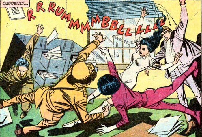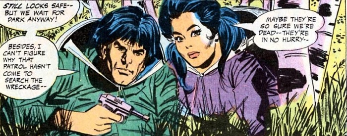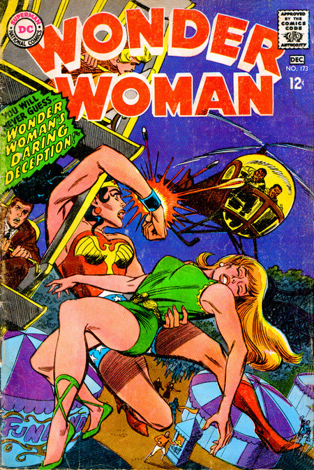 И как-то так незаметно сегодняшний пост пора бы уже и завершать – и для этого подойдёт комикс Wonder Woman #170 за май 1967 года, от Роберта Кэнайера и Росса Эндрю. В первой из двух историй до Чудо-Женщины ВНЕЗАПНО доходят слухи о том, что Стив Тревор всё-таки погиб при испытании нового самолёта. Печалька. Доходят эти слухи и до Доктора Психо, и гнусный карлик решает ими воспользоваться. Он делает одному из своих подручных пластическую операцию, которая делает преступника похожим на Стива Тревора. Теперь прихвостни Психо могут невозбранно совершать преступления – Чудо-Женщина не может заставить себя как-либо помешать «возлюбленному». Даже когда Диана осознаёт, что это не Стив, она всё равно не может настучать ему по зубам. Тем не менее, когда злодей сбегает после очередного «дела», Диана собирается с духом – и сбивает его самолёт. А на месте крушения видит двух Стивов Треворов, и каждый считает себя настоящим. Настоящего Стива удаётся вычислить, когда на полянку, где всё это происходит, выходит медведь. Лже-Стив пускается наутёк, а настоящий Стив, хоть и измотанный и немного раненый, обещает Диану защитить. Но получается несколько иначе. Медведя обезвреживает сама Диана, а настоящий Стив вырубает самозванца.