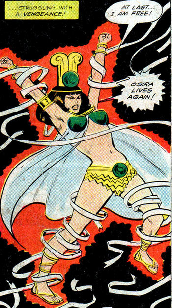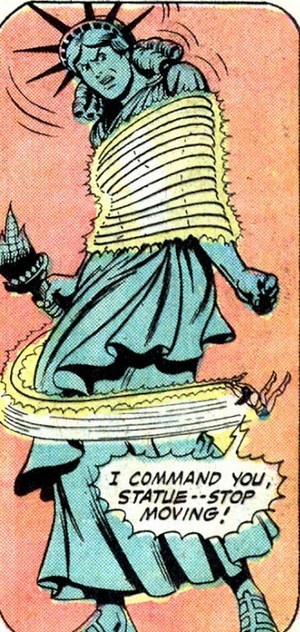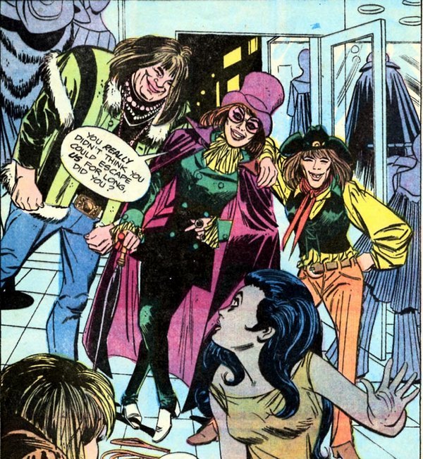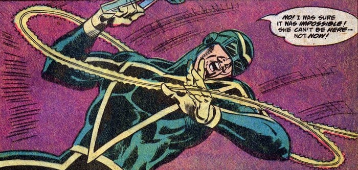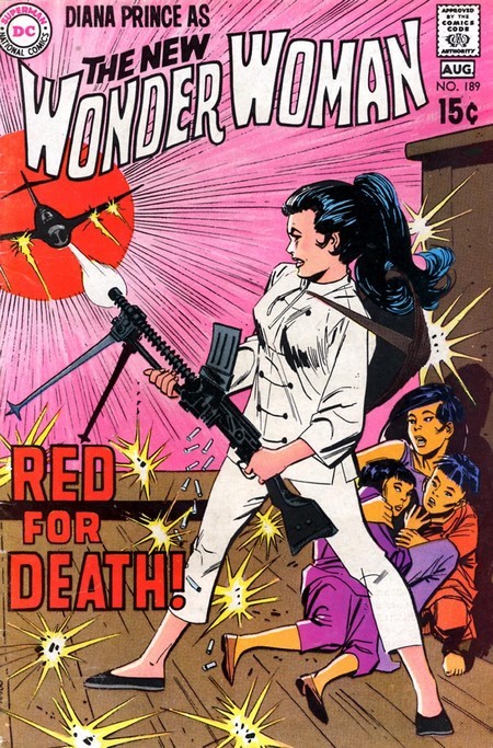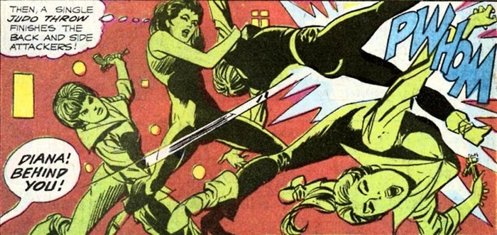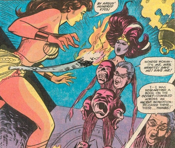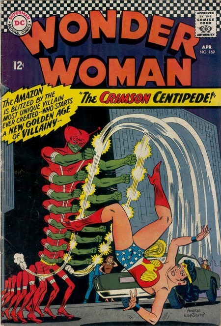 А в комиксе Wonder Woman #169 наступает пора блеснуть звезде сегодняшней подборки. В разговоре с Афродитой Марс, бог войны, похваляется, что создал существо, против которого даже могучая Чудо-Женщина будет бессильна – Алого Многоножника (Crimson Centipede)! Многорукое существо вооружено до зубов, на каждую пару рук – по пистолету! И оно грабит банки, потому что может. При первой встрече Многоножник легко отбивается от Чудо-Женщины, застав её врасплох своей богатырской силушкой (ещё бы, столько ручек) и неожиданной ловкостью (от метко брошенного лассо уклоняется без напряга). После следующего поражения Чудо-Женщина молится Афродите, но та не отвечает – поспорив с Марсом, она заявила, что Диана справится и без её помощи. При третьей встрече Многоножник устраивает Чудо-Женщине «ораораора», а затем достаёт пистолеты и обрушивает град пуль. Диана их все отбивает – но отвлекается, увидев Стива Тревора, и прошедшая по касательной пуля её нокаутирует. А Многоножник снимает с Дианы браслеты – «вот она проснётся, а я опять начну стрелять, а отбивать ей уже нечем!». Это была большая ошибка. Без браслетов Чудо-Женщина впадает в четыреждыгадскую ярость и сама устраивает Многоножнику такое «ораораора», что он после такого только на экзотическое блюдо вьетнамской кухни сгодится. Стив Тревор же, рискуя собой, надевает на буйствующую Чудо-Женщину браслеты – и она приходит в себя.