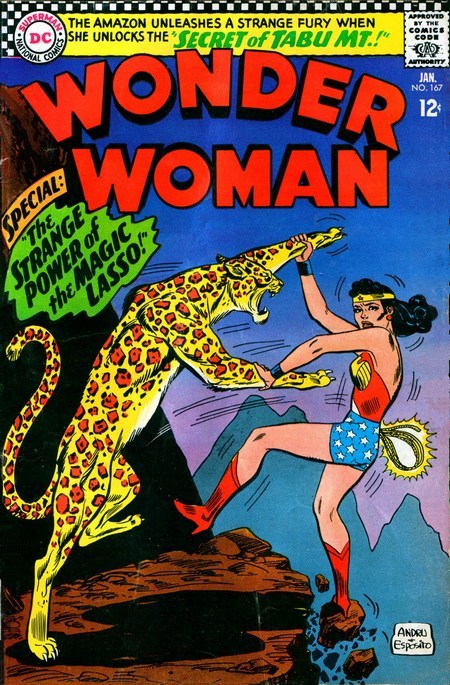 Истории на этом не заканчиваются, ведь впереди комикс Wonder Woman #167 за январь 1967 года, всё от тех же Роберта Кэнайера и Росса Эндрю. Чудо-Женщина получает письмо с просьбой о помощи от Дианы Принс – настоящей, которая, помнится, в Южную Америку переехала. Возлюбленный Дианы, Билл, отправился на экскурсию в горы – и пропал без вести. Настоящая Диана Принс уверена, что он погиб, и ей теперь слишком горько оставаться в Южной Америке – она намерена вернуться в США. Засада! Надо бы этого Билла найти, чтобы Диана Принс не вернулась в США. Потому что, разумеется, о таких понятиях, как «тёзка» и «однофамилец», в многомиллионной стране не слыхивали, и Диана Принс может быть только одна, ага. Оказывается, Билла взяло в плен племя инков, живущее на горе Табу, и его намерены принести в жертву богам. Чудо-Женщина бросает вызов богам (проще говоря – побеждает и скидывает с большой высоты дикого леопарда и переживает оползень, отбивая сыпящиеся камни браслетами), после чего инки такие приседают на очко. «О амазонка! Твоя магия сильнее магии наших богов! Говори, чего хочешь – всё по-твоему будет! – Правда, что ли? Ну тогда освободите этого мужика и больше человеческих жертв не приносите, живите по заветам любви, доброты и сострадания, как амазонки. – А можно хотя бы раз в год сердечко кому-нить вырезать? – ЛЮБВИ, ДОБРОТЫ И СОСТРАДАНИЯ! – Ну ладно (((«, Билл спасён, а значит, настоящая, неамазонская Диана Принс остаётся в Южной Америке!