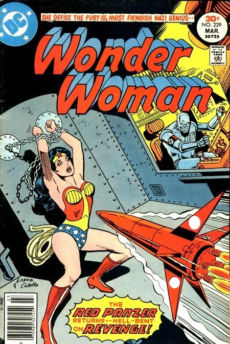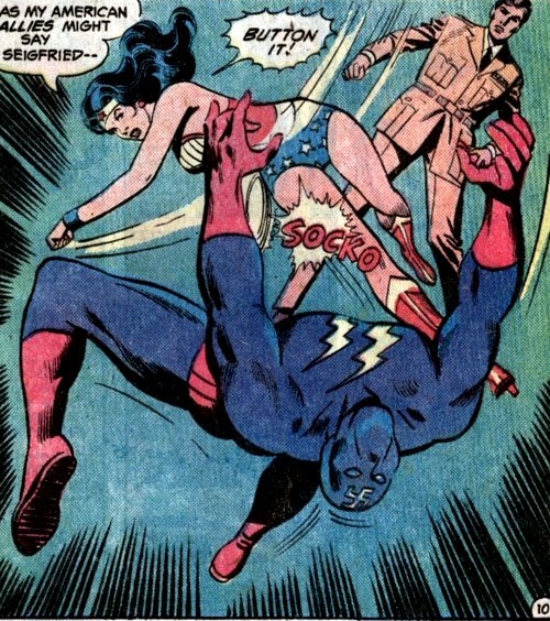 А во второй истории в красавца Стива Тревора влюбляется уже другая злодейка – шпионка Паула фон Гунта (да, в ранних комиксах она была Паулой фон Гюнтер, но теперь вот упростили Gunther до Guntha. Читается-то одинаково). Пройдя пластическую операцию, чтобы стать красивее, Паула пытается охмурить Стива, поручив своей банде уничтожение Чудо-Женщины. Но все попытки проваливаются с треском – и Диану так просто не уничтожить, и Стива, видимо, не интересуют арийские валькирии. Решив «так не доставайся же ты никому», Паула собирается убить Стива…руками Чудо-Женщины. Завладев волшебным лассо и обездвижив Диану с его помощью, Паула снимает с рук Дианы Браслеты Подчинения. А без них Диана лишается не только возможности отбивать пули, но и контроля над своей амазонской яростью. В режиме четыреждыгадской ярости Диана ломает локомотив поезда, в котором по своим делам едет Стив, и вырванный движок поезда имеет все шансы оставить от Паулы размазню. Впрочем, Диана быстро находит свои браслеты, надевает их и не даёт движку локомотива убить Паулу фон Гунту. Остановив поезд и обезвредив шпионку, Диана передаёт её властям. Паула настаивает, чтобы её передали на поруки Стиву Тревору на 99 лет, но Стиву она, в общем-то, нафиг не впёрлась.
