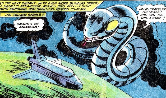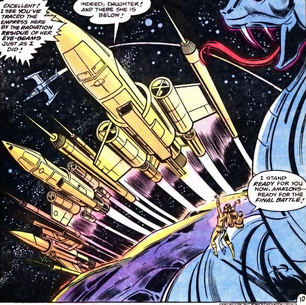 Долго скучать после похорон не приходится, ведь впереди комикс Wonder Woman #252 за февраль 1979 года, от тех же Харриса и Дельбо. Новые события в жизни у Дианы Принс: её приняли на работу в НАСА! Дел хватает и у Чудо-Женщины – она ловит терпящую крушение посадочную капсулу с шаттла. Астронавт внутри несёт какой-то бред про «Императрицу серебряной змеи». Отдышавшись, астронавт объясняет, что с ним приключилось. На него в космосе напала исполинская серебряная змея! И это были не галлюцинации. Ну, он так уверен. Из змеи выбралась девица с обложки, представилась Астартой, сообщила астронавту, что он не тот, кого она ищет, и пнула его капсулу к Земле. Похоже на работу для Чудо-Женщины!