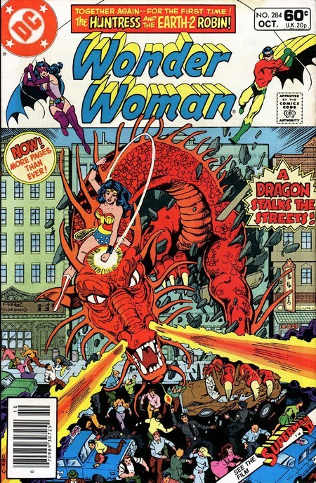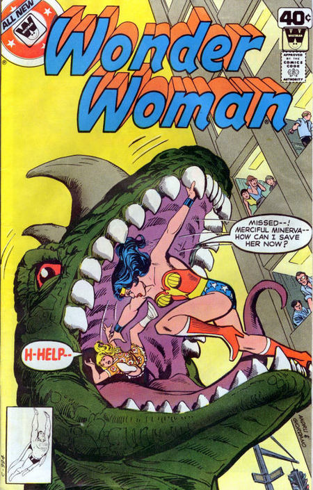А на очереди комикс Wonder Woman #257, на обложке которого Годзилла харчится. После предательства Бэйли Диана поняла, что в Хьюстоне ей делать нечего, так что Чудо-Женщина возвращается в Нью-Йорк, стремясь найти новую цель в жизни после смерти Стива Тревора (в прошлой подборке). Проблем с деньгами у неё всё равно не будет – с Райского острова поступает стабильный приток зоита. А в Нью-Йорке неспокойно – динозавр объявился! Да огромный! И он как-то странно себя ведёт, словно прислуживает бандитам, которые в это время грабят инкассаторов. Динозавр отвлекает Чудо-Женщину, пытаясь слопать ребёнка, но Чудо-Женщина выхватывает девочку прямо из пасти чудовища. А вот поймать динозавра не удаётся – он растворяется в воздухе, без следа.