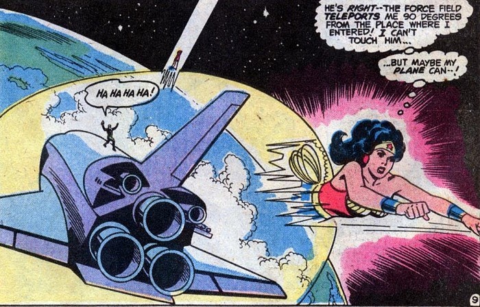 Выйдя в космос, Диана обнаруживает, что злодей окружил шаттл «угловым полем» – при попытке влететь в это поле Чудо-Женщина вылетает в другой стороны, под углом. Поле настроено на Чудо-Женщину и всё её снаряжение, так что прямая атака бесполезна. Но у Чудо-Женщины есть запасные варианты – боевая миссия с участием НАСА! Увы, и тут что-то идёт не так. Знакомых Дианы Принс в НАСА словно подменили. Они алчны, обманывают её и стремятся к завоеванию. Стопэ...знакомое поведение! Ну конечно...в тела знакомых Дианы вселились Герцог Обмана, Граф Алчности и Лорд Завоевания. Но не всё потеряно, ведь в тело женщины-астронавта вселилась сама Афина! Вычислив, что к чему, Чудо-Женщина прибегает к помощи Афины, и та изгоняет прихвостней Марса из тел астронавтов и обезвреживает Угольника. Марс бомбит. «Э, так не честно! Чудо-Женщина жульничала! – А ты типа нет? Короче, воинственный, завались. Я официально постановляю, что Диана доказала, что достойна звания Чудо-Женщины». А шаттл, кстати, удалось безопасно посадить. А угольник Угольника рассыпался и пропал.