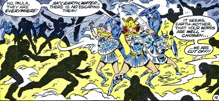 Ипполита же сообщает, что собрала достаточно информации, и компьютеры на Райском острове могут её проанализировать и подсказать, что это за Астарта такая. А Диана подозревает, что мама от неё что-то скрывает. Вскоре амазонки выслеживают Астарту, и начинается матч-реванш. Но похоже, Астарта знает все слабости амазонок! Она сваривает браслеты нескольких амазонок и лишает их силы (и ни слова о том, что тут триггер может быть только на мужика...ну или у Астаты есть нюанс), и уничтожает браслеты одной из амазонок, в результате чего амазонка впадает в бешенство. В какой-то момент Ипполита узнаёт, что это за Астарта такая. Эта Астарта – Диана. В прошлой подборке была упомянута амазонка по имени Диана, которую убил Геркулес задолго до рождения будущей Чудо-Женщины. Её дух не упокоился, она летала по космосу и слилась с астероидом, который состоял из серебра и золота (и запилила себе новое, металлическое тело). А потом заглянула на Райский остров и увидела, как думала, своего злого двойника, Диану, которую там все почему-то почитали. И обозлилась. Астарте Ипполита объясняет: «Эта Диана – не злой двойник, а моя дочь, и когда я её лепила, из того, что было, то вдохновлялась тобой». Выслушав и проникшись, Астарта понимает, что пора бы и упокоиться, и её душа уходит в объятия богинь.