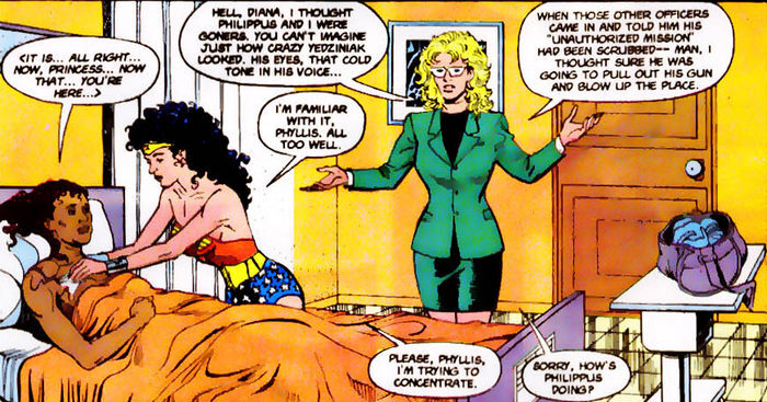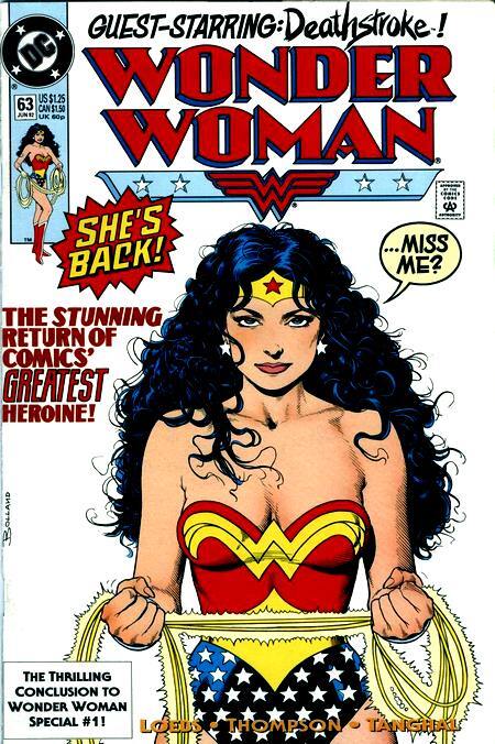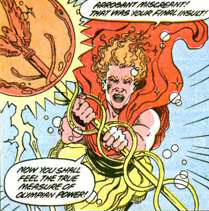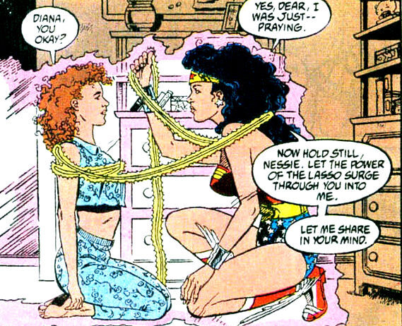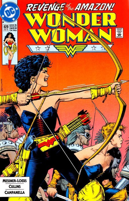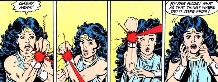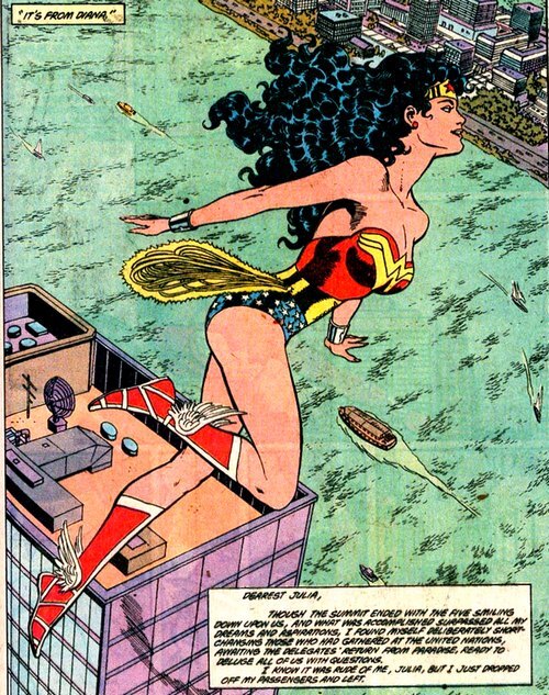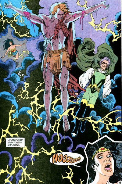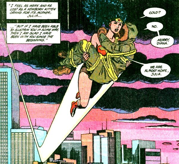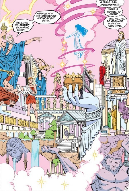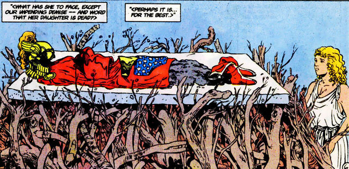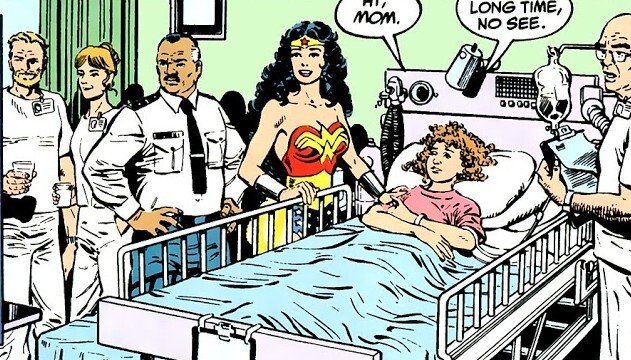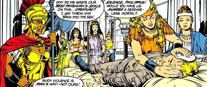 Вот так приключения Чудо-Женщины едва начались, а она уже на грани смерти после избиения от рук Ареса. Пора перейти к комиксу Wonder Woman #7 за август 1987 года. Тяжело раненую Диану Гермес доставляет на Темискиру, где Посейдон с Нереидами сооружает ей целительную ванну. Все боги Олимпа собрались и всячески празднуют, хвалят и благодарят Диану, которая только что всех спасла. Особенно воодушевлён Зевс, ведь Арес хотел убить целенаправленно его. А вот Гере не нравится новый интерес Зевса к амазонкам, да и Афину с Артемидой это несколько тревожит. Искупавшись и излечившись, Диана тут же просит у мамы разрешения вернуться в мир мужчин. Для начала, ей сам Арес задание дал, просвещать людей и сопротивляться его усилиям. Ну и кроме этого, надо подлечить Ванессу Капателис. Вздохнув, Ипполита дарит Диане Сандалии Гермеса, которые позволяют мгновенно перемещаться между миром мужчин и Темискирой.