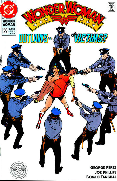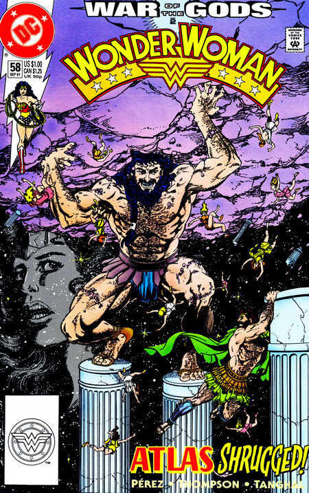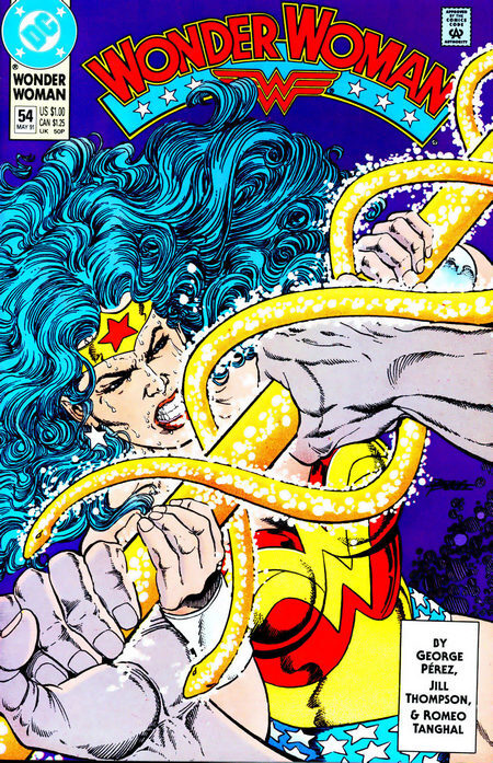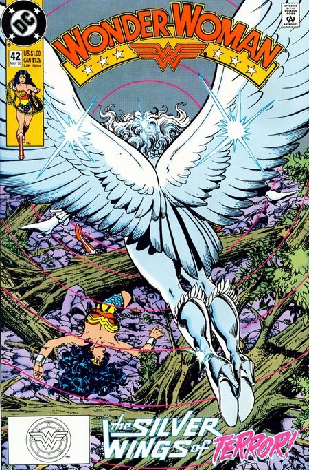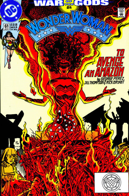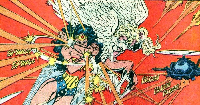 Прибывает на родину Диана в комиксе Wonder Woman #10 за ноябрь 1987 года от Лена Уайна и Джорджа Переса, который завершит сегодняшнюю часть подборки. Возвращается Диана на Темискиру – а на Олимпе боги всё ещё бухают, празднуют победу над Аресом. Наконец, Зевсу в голову (угадайте, которую из двух) приходит замечательная идея – спуститься на Темискиру и лично отблагодарить каждую амазонку. Некоторых, возможно, дважды. Кого-то в виде лебедя, ну, фантазией в этом плане Зевс точно не обделён. Об этом узнаёт Артемида, сообщает Афине, та – Гере. И вот, спускается Зевс на Темискиру и в первую же очередь хочет охмурить Диану. А та в отказ. Такого Зевс стерпеть не может, и собирается всех амазонок молниями перебить – но Гера утааскивает его за шкирку обратно на Олимп.