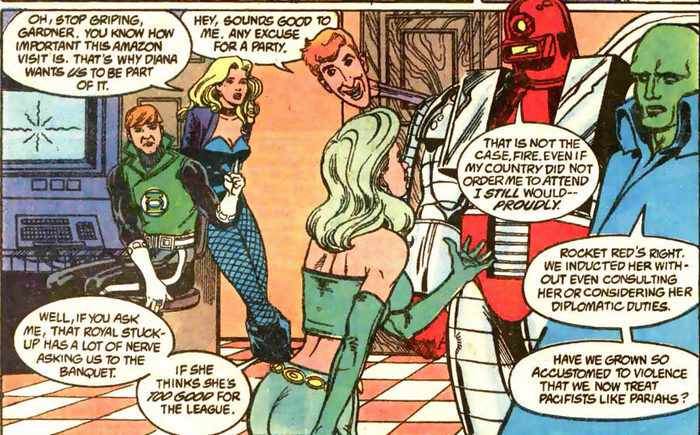 Предлагаю перейти к комиксу Wonder Woman #8. Чудо-Женщина потихоньку знакомится с миром, а мир – с Чудо-Женщиной. Пока Диана ещё не полностью освоила английский язык, Джулия Капателис служит её переводчицей. С её помощью Чудо-Женщина выступает в ООН – но, мягко говоря, безрезультатно. Половина делегатов не воспринимает её всерьёз («ну правда, что толкового может сказать баба?»), представитель СССР и вовсе обвиняет её в приверженности тлетворным идеям Америки. Настроение Диане портит ещё и общение с военными. Военных впечатляет её силушка, но бесит пацифизм и нежелание отдать своё оружие (лассо, тиару и браслеты) в лабораторию для анализа. Потом ещё и наглый журналист Г. Гордон Годфри выпендриваться начинает со своей кампанией против супергероев, его сторонники начинают нападки на Джулию и Ванессу Капателис за то, что те дали приют Чудо-Женщине.
