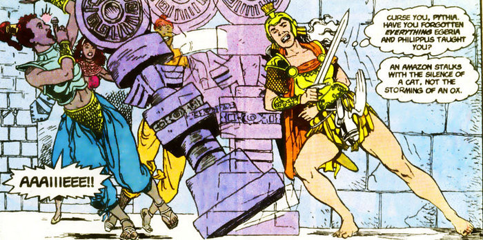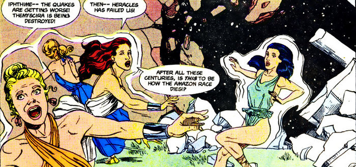 Но и Арес не сидит на божественном заду ровно – он берёт в оборот Геракла, сына Зевса, и отправляет его с миссией «Сокрушить амазонок». В бою амазонки оказываются огого, так что Геракл идёт другим путём. Объявив о перемирии и устроив пир, Геракл спаивает амазонок забодяженным вином, после чего отнимает пояс Ипполиты в качестве трофея, и, довольный, уезжает в закат. Проснувшись и похмелившись, Ипполита жаждет мести – но богиня Афина напоминает, что месть это не по-амазонски, так что Ипполита клянётся жить мирно. А вот Антиопа протестует, мол, что это ещё за путь терпилы. Поклявшись мстить членоносцам, Антиопа официально отказывается подчиняться воле Олимпа, отдаёт Ипполите свой пояс и сваливает со своими сторонницами. Ипполита со своими бабцами из Темискиры тоже сваливают, потому что от города-государства остались одни руины.
