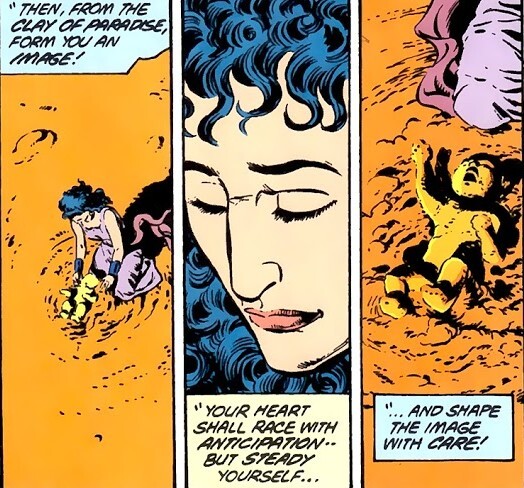 Переселяются амазонки Ипполиты на островок в Эгейском море. Райское местечко, в катакомбах под которым кишат демоны. Таково наказание амазонкам за борзоту и за то, что позорно продули Гераклу – вечно стеречь демонов, живущих под райским островом. На острове амазонки строят Новую Темискиру, и всё идёт хорошо...но Ипполита чувствует, что чего-то не хватает. Тут-то богини и раскрывают ей, что она является реинкарнацией души беременной пещерной женщины, и потому инстинктивно хочет ляльку. Помните про последнюю оставшуюся душу? Ипполита лепит из волшебной глины статую прекрасной девочки, а богини (и Гермес) вкладывают в эту статую последнюю душу из Пещеры Душ и свои благословения – силу, ловкость и т.д. Так родилась Диана, самая особенная из амазонок.