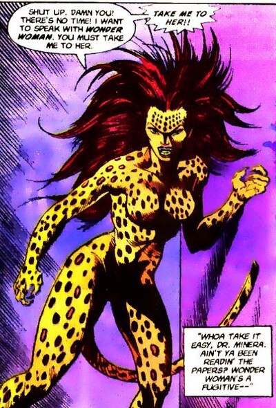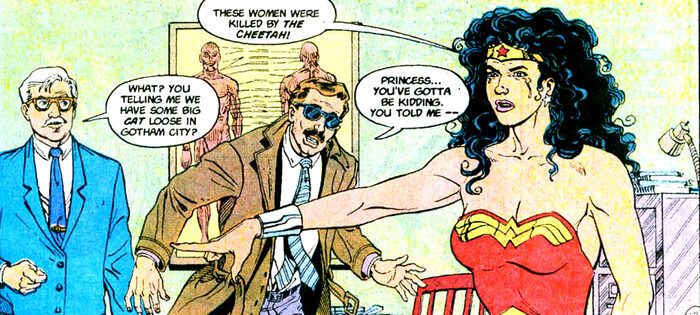 Выследив Чудо-Женщину, Гепардица нападает – и чисто физически оказывается не слабее самой Дианы. Кроме того, когти Гепардицы способны ранить Диану, к чему практически неуязвимая Чудо-Женщина не привыкла. Попытка связать Гепардицу волшебным лассо тоже ни к чему толковому не приводит – в теории, кошатница должна увидеть какую-нибудь истину, понять, что поступает нехорошо, и сдаться. Даже на бога войны подействовало! А её не берёт. Злодейка имела все шансы выцарапать Диане глаза и разорвать глотку – но тут объявляется Джулия Капателис с охотничьим ружжом. Один выстрел – и подбитая, но живая Гепардица обращается в бегство. Диана же, и до того расстроенная всеми ужасами мира мужчин, приходит к выводу, что ещё недостаточно готова ко всему творящемуся на Земле безумию, и собирается вернуться на Темискиру. «Никогда в мире мужчин не жили, нечего и начинать».