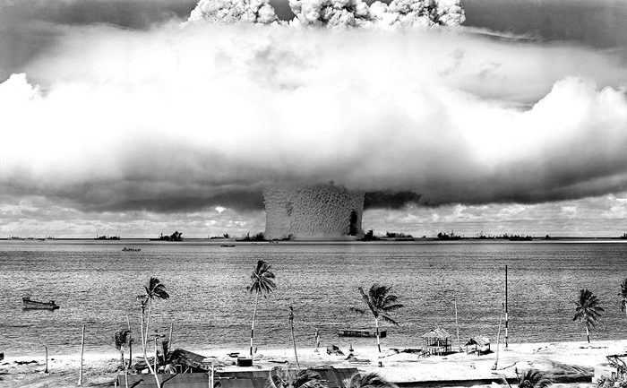 Был случай, когда США хотело поиграть мускулами, но.... гулко пукнули в июле 46-го, когда пригласили полмира на 23-х килотонный фейерверк. Поставили на якорь в бухте атолла Бикини 95 кораблей (списанных или захваченных, война ж была) и жахнули по ним ядеркой. Ну они думали, что жахнули, а по факту пукнули — затонуло всего лишь 2 корабля из всей эскадры...