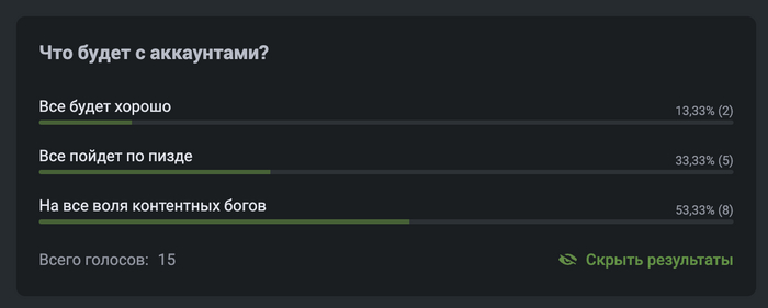 Я проводил один маленький эксперимент с заморозкой на неделю. Публиковал на протяжении месяца по 3 ролика в неделю, а потом на неделю просто перестал публиковать. Вот результаты голосования с прогнозом - что же произойдет теперь с охватами: