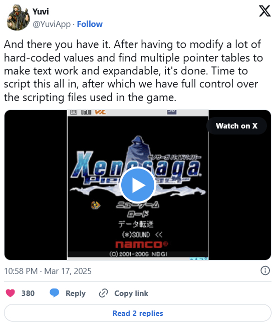 "После многих лет неустанных поисков Xenosaga Pied Piper наконец настал день, когда она была сохранена для всеобщего ознакомления", – говорит переводчик ValakTurtle. "Это поистине монументальный момент для поклонников серии Xeno, поскольку это была единственная недостающая игра в серии", – говорят они, прежде чем добавить: Во-первых, я не могу выразить достаточной благодарности Keitai Wiki Discord за многие месяцы напряжённой работы и самоотверженности, которые они вложили в сохранение этой игры. Я особенно хотел бы поблагодарить MemoryHunter за то, что он начал всё движение по сохранению Keitai (кэйтай – японские мобильные телефоны), xyz за то, что он был ведущим специалистом по реверс-инжинирингу телефона, на котором была игра (он действительно совершил какое-то волшебство, чтобы её извлечь), LNRC за то, что он постоянно информировал нас о статусе проекта и извлёк данные из нескольких телефонов, чтобы помочь нам лучше понять аппаратное обеспечение телефона, cuebus за помощь в извлечении данных из телефонов, RockmanCosmo за то, что он является столпом сообщества Keitai, и всех остальных, кто внес свой вклад в наше дело. Я также бесконечно благодарен анонимному донору, который согласился извлечь для нас игру. ValakTurtle говорит, что они "уже начали работу над полным патчем перевода игры в качестве члена Vector Translations & Preservation, вместе с ромхакерами на сервере Keitai Wiki (привет Юви)".