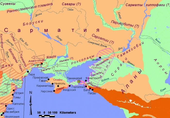 В IV веке нашей эры грянула всеевропейская катастрофа под названием Великое переселение народов. Крымские скифы были окончательно разгромлены вторгшимися готами, римляне сделали тапки, большинство греческих полисов было уничтожено, либо пришло в запустение, а их население либо релоцировалось в иные края, либо погибло. Устояло только Боспорское царство.