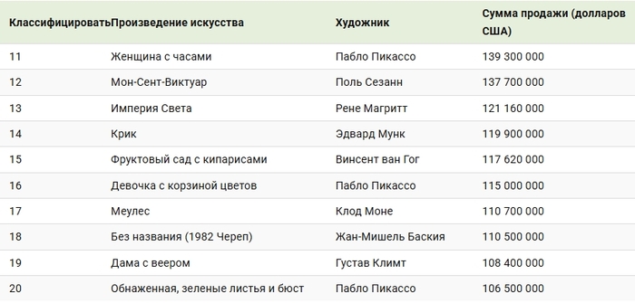 Приведенный ниже список ранжирует 20 самых дорогих произведений искусства, когда-либо проданных на аукционах, используя данные ARTnews и визуально составленный Джули Пизли .