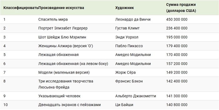 Возглавляет этот список картина Леонардо да Винчи «Спаситель мира», проданная за рекордные 450 миллионов долларов.