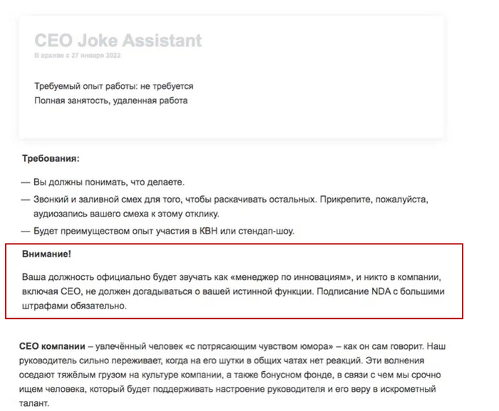 Вакансию уже увели, но не можем прятать такой бриллиант. Нужно поднимать начальнику настроение, только чтоб он не знал, что так задумано.