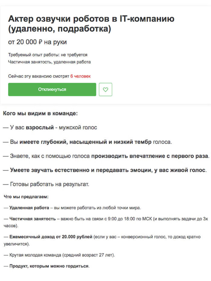 Как бы ни был развит искусственный интеллект, озвучивает его человек. В требованиях к кандидату — производить впечатление, говорить взвешенно и не забывать про эмоции.