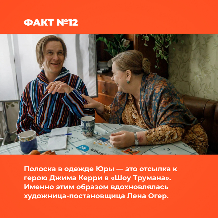 - Антон Кузнецов, который играет Юру, до самого конца съемок принципиально не смотрел ни фото, ни видео с Юрой и тем более, не виделся с ним лично. Он создал своего Юру, исходя из сценария. Отсюда и разница: в жизни Юра не такой позитивный весельчак, как в фильме. Он скорее неунывающий, чем веселый. И разговаривает он в целом, нормально. Просто по жизни более наивный и простой, чем большинство.