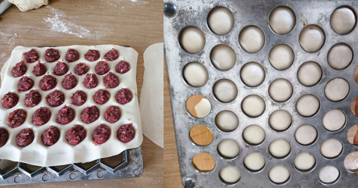 Зато зацените насколько идеально и равномерно распределен фарш во второй партии)) Очень волновался что и во второй раз он местами выпирает, что задел места стыка или вылезли еще какие-то еще косяки. Но нет. Кайф, ошибки исправлены и усвоены. Фарша пихал поменьше и благодаря этому пельмехи буквально сами вываливались из формы.