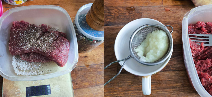 А пока тесто расстаивается, к мясу. Я люблю посолонее, добавляю обычно около 1.5% соли на вес мяса. Обычному человеку и 0.75% будет предостаточно.