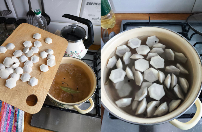 Ну и довольно тяжелой задачей оказалось обрезать фарш)) Ножницами слишком неудобно, а ножиком я постоянно задевал и рвал основу на углах стыка пельменин. Нужно было срезать самым кончиком ножа и держать ножик почти параллельно форме.