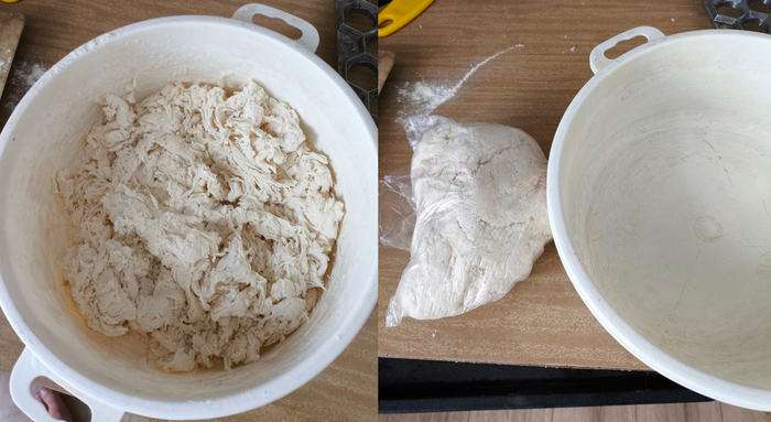 Ложкой пока не схватится и не забьётся, а далее в один ком и в пакет. Оно слишком сухое чтобы с первого замеса его прям МЕСИТЬ в однородную текстуру, да и из прошлых постов про питсу, я надеюсь, вы уже сделали вывод, что тесто это всегда замес-расстойка-домес-расстойка и так пока тесто не станет желаемой идеальной, однородной, слегка липкой текстуры.
