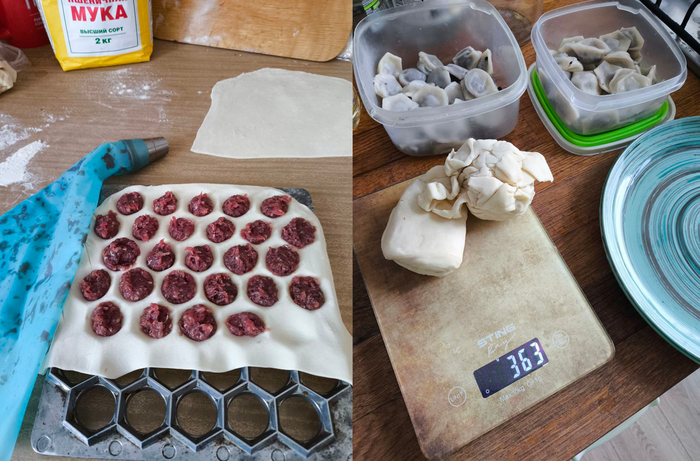 Так что будете делать дома пельмени в форме, знайте, что на 500г фарша нужно около 350-450 г теста (дабы даже новичку, который так не наслоит и не раскатает тонко как я, хватило теста). Лишнее выкинул.