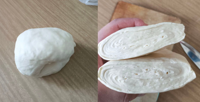 Раскатав под размер формы понял, что какое-то тесто слишком толстое)) Нужно катать еще х2, до толщины как у чебуречного теста, чтобы аж просвечивало.