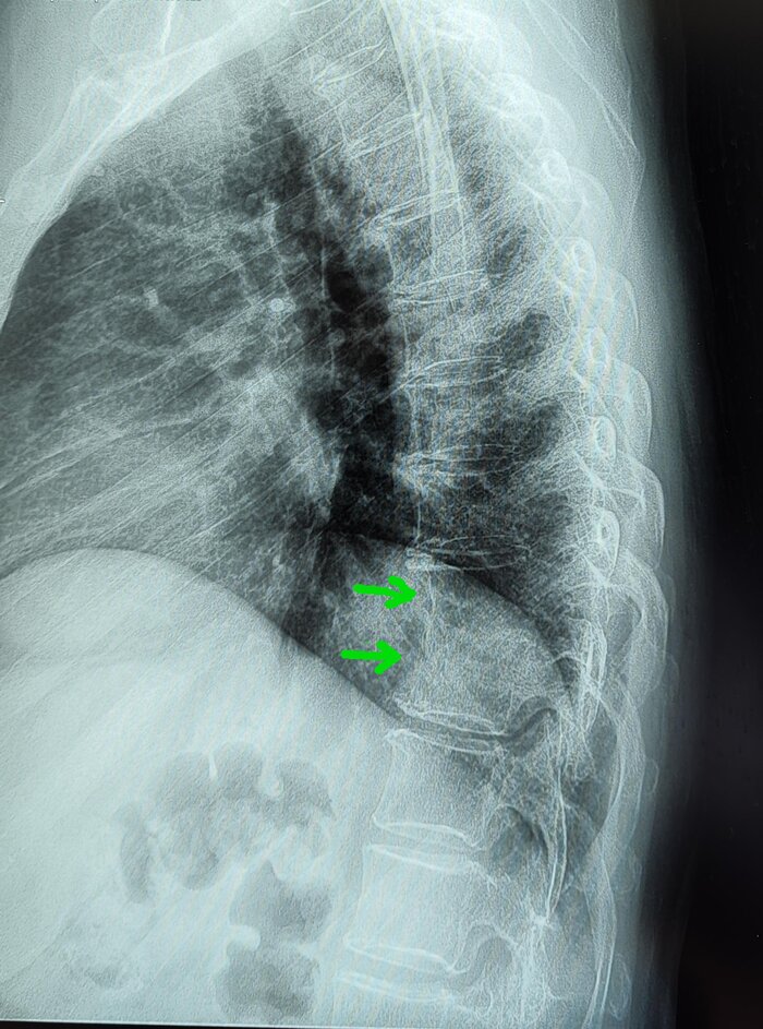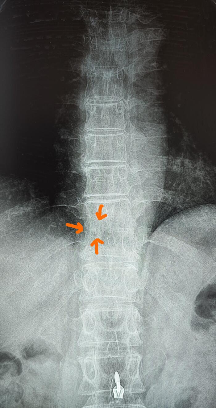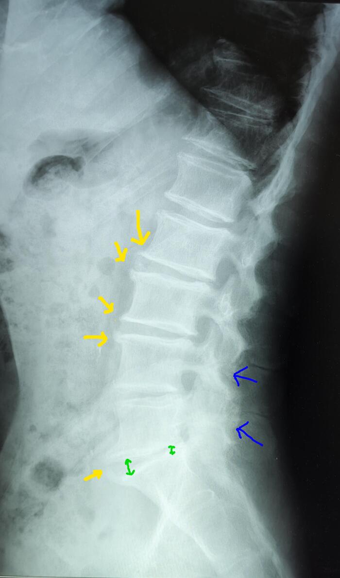 На Р-граммах поясничного отдела позвоночника в 2х проекциях: структура костной ткани позвонков разряжена, высота тел L3,L5 неравномерно снижена в пределах 20% в передних и средних отделах, неравномерное умеренное сужение межпозвонковых рентгенологических пространств, субхондральный склероз замыкательных пластинок, краевые остеофиты. Оссификация передней продольной связки позвоночника на всем протяжении-синдесмофиты.