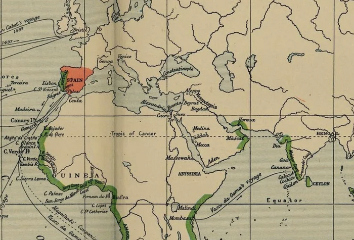 Португальцы намеревались прорваться за мыс Бохадор и дойти до Индии, но двигаться не на восток через Средиземное море, из которого ещё не прорыли Суэцкий канал в Красное море; не на юг в обход всей Африки, а на запад через Атлантику: земля-то круглая. Ни об Америке, ни о Тихом океане моряки пока не знали. Свои намерения Португалия узаконила с помощью римских пап Николая Пятого и Каликста Третьего в 1452—1456 годах.