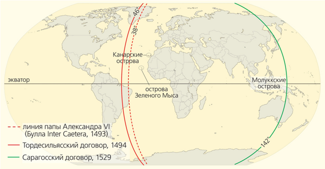 ...и демаркационная линия между будущими владениями двух стран в Новом Свете переехала на 370 лиг (около 1500 км) к западу от островов Зелёного Мыса. Граница прошла через всю Атлантику с севера на юг. Моря и земли к востоку от папского меридиана стали считаться собственностью Португалии, а к западу — собственностью Испании. Так в конце XV века весь мир, который во многом ещё предстояло открыть и разведать, был заблаговременно поделён между главными морскими державами.