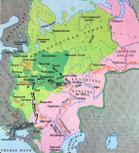 В 1547 году Иван Четвёртый Грозный, великий князь Московский и всея Руси, стал первым русским царём и положил начало созданию России как государства. Но расширение страны проходило по суше — на северо-запад и главным образом на восток, за Урал и дальше в Сибирь, планомерное освоение которой началось в 1580-х.