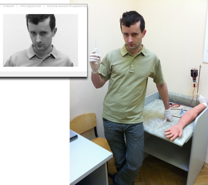 В одном из институтов, где я работал лет 10 назад, оказывается, до сих пор висит на сайте моя фотография. Для меня юмор в том, откуда взята эта фотография. В 2011 году я записался на курсы первой помощи и попал в группу с альпинистами. А они просили научить их делать уколы, ну и послали всю группу к медикам. И всех альпинистов, и пару непричастных, включая меня.