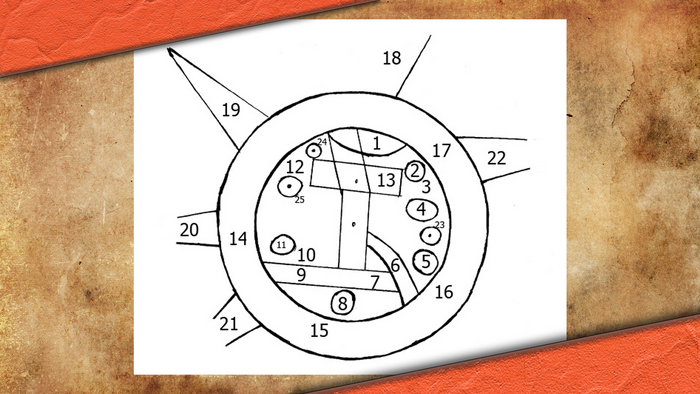 Как мы можем наблюдать, Земля представлена как три острова, дрейфующих в океане, и не отличается точностью. Центр мира находился в Дельфах (занятный эллиноцентризм). Однако уже можно наблюдать узнаваемы очертания Средиземного и Чёрного моря.