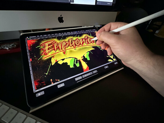 Процесс создания был совмещён с помощью программы Фотошоп и расшариванием экрана на айпад с яблокарандашом: