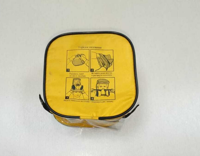 Также с одной стороны сумки напечатаны картинки, наглядно нарисованная инструкция о том как надеть самоспасатель.