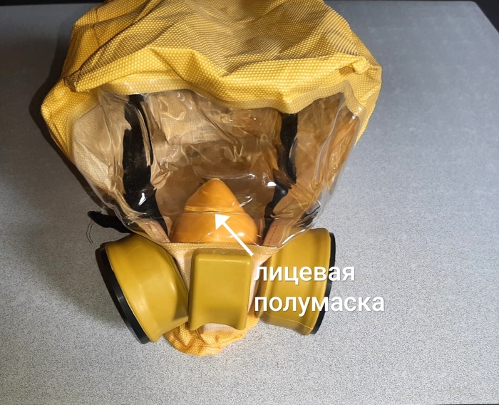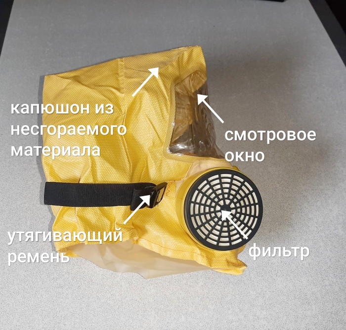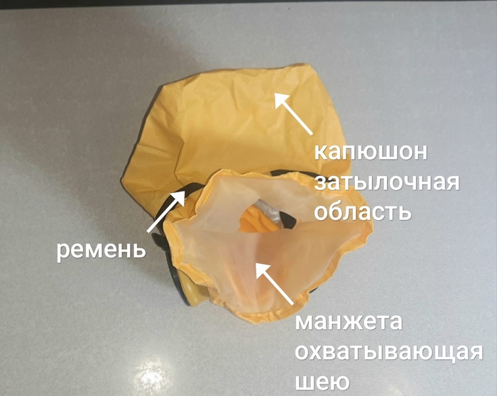 Внутри капюшона имеется пространство между головой и материалом самоспасателя (воздушная подушка), это дополнительно защищает от воздействия высоких температур.