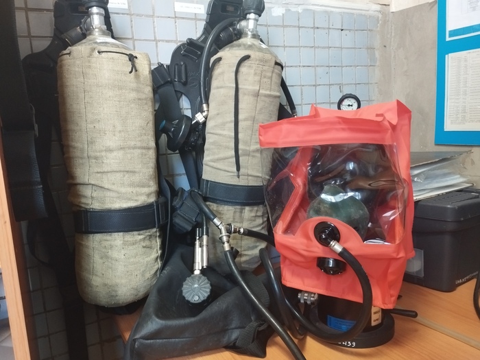 На фото самоспасатели слева на право: изолирующий противогаз ИП-4М, большая оранжевая коробка, это СПИ-50, ниже СПИ-25, маленькие справа это фильтрующие самоспасатели ГДЗК-У и Шанс-Е.