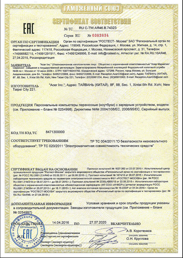 Изготовитель ноутбука Acer Inc. Расположен в Тайване (Китайская республика) по адресу: 1F, 88, Sec. 1, Xintai 5th Rd. Xizhi, New Taipei City 221, Taiwan, Tel: +886-2-2696-1234 Email: investor.relations@acer.com. Между РФ и Тайванем (Китайской Республикой) отсутствует международный договор о правовой помощи, Тайвань не является участником Нью-йоркской конвенции 1958 г., данное государство является не признанным в мире (признано только 23 государствами).