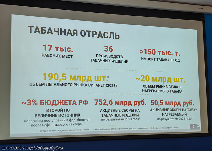 А ещё я узнал, что российский табачный рынок весьма уважаемый в мире. Что касается России, то эта отрасль - второй по величине источник налогов в бюджет (примерно 3 % бюджета РФ). В стране работают 36 производств табачных изделий, где трудятся 17 тысяч человек. На российском рынке есть четыре ключевых игрока, на долю которых приходится 94 % рынка. По итогам прошлого года объем легального рынка сигарет составляет 190,5 млрд штук.