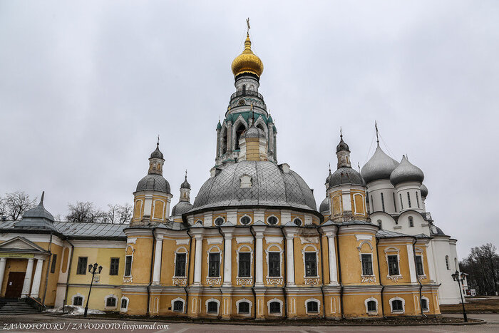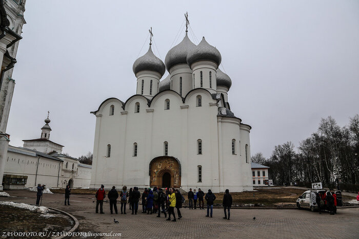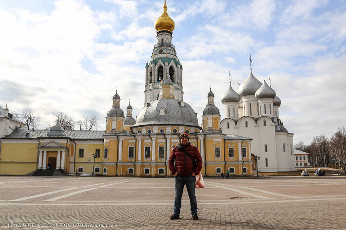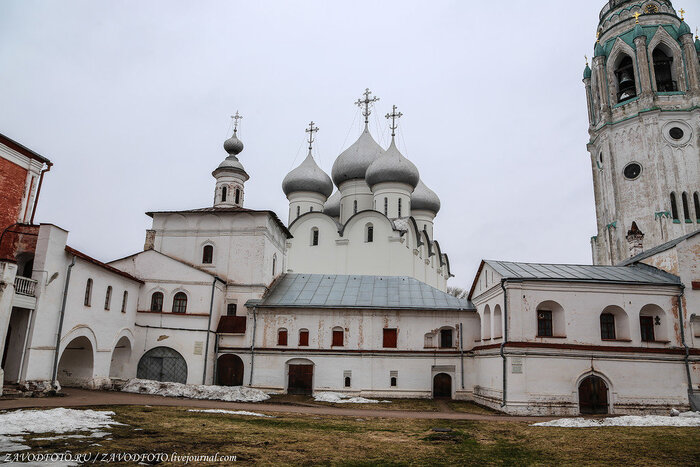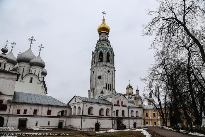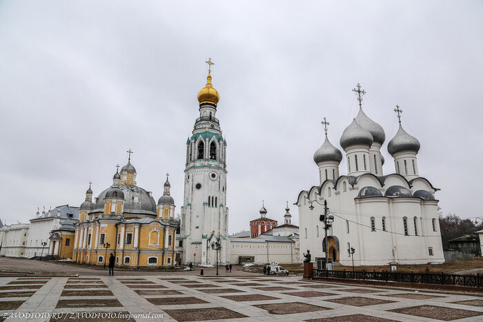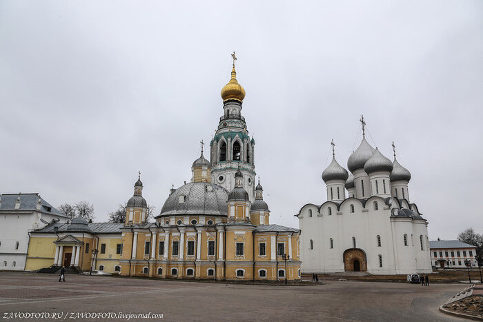 Софийский собор - это первый каменный храм и главная вологодская святыня. К её строительству приложил руку сам Иоанн Васильевич Грозный. В 1565 году он начал сооружение каменной крепости, по площади вдвое превышающей Московский Кремль. Иван Грозный успел выстроить две каменных стены с 11 башнями, основал могучий Софийский собор, заложил еще несколько храмов и каменные палаты. К Софийскому собору примыкает ансамбль, условно именуемый Вологодским кремлем, но на самом деле являющийся усадьбой архиерея.