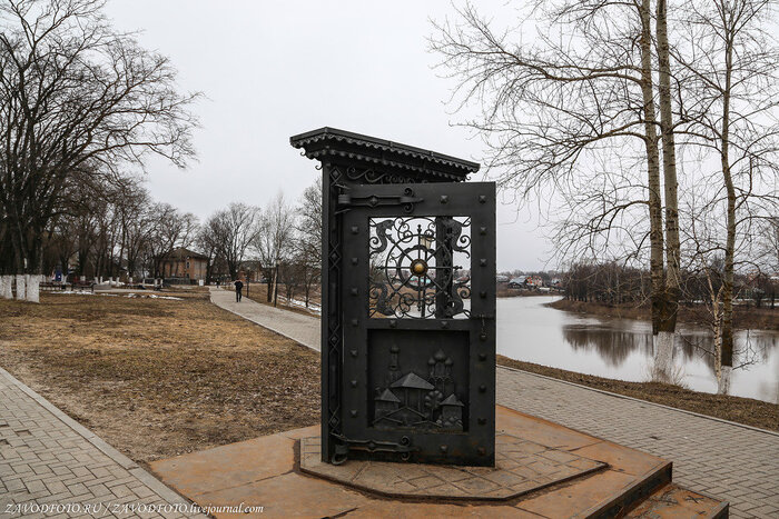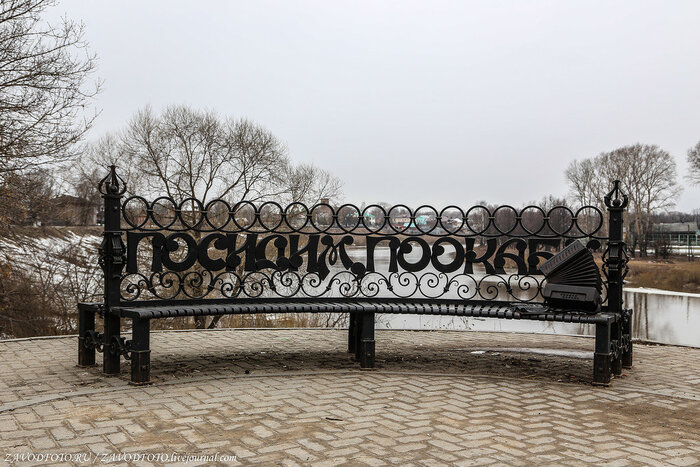 Cкамья "Посидим, поокаем" на набережные реки Вологды. Она здесь появилась 27 июня 2015 года и стала подарком вологжанам ко Дню города от кузнецов-участников II-го международного фестиваля народных промыслов «Голос ремесел». По замыслу авторов, скамья с такой надписью должна стать символом гостеприимства вологжан. Скамья «двусторонняя» - у двух «лавочек» одна общая спинка - таким образом, смотреть можно на реку или на аллею, которая идёт от Кремлевской площади.